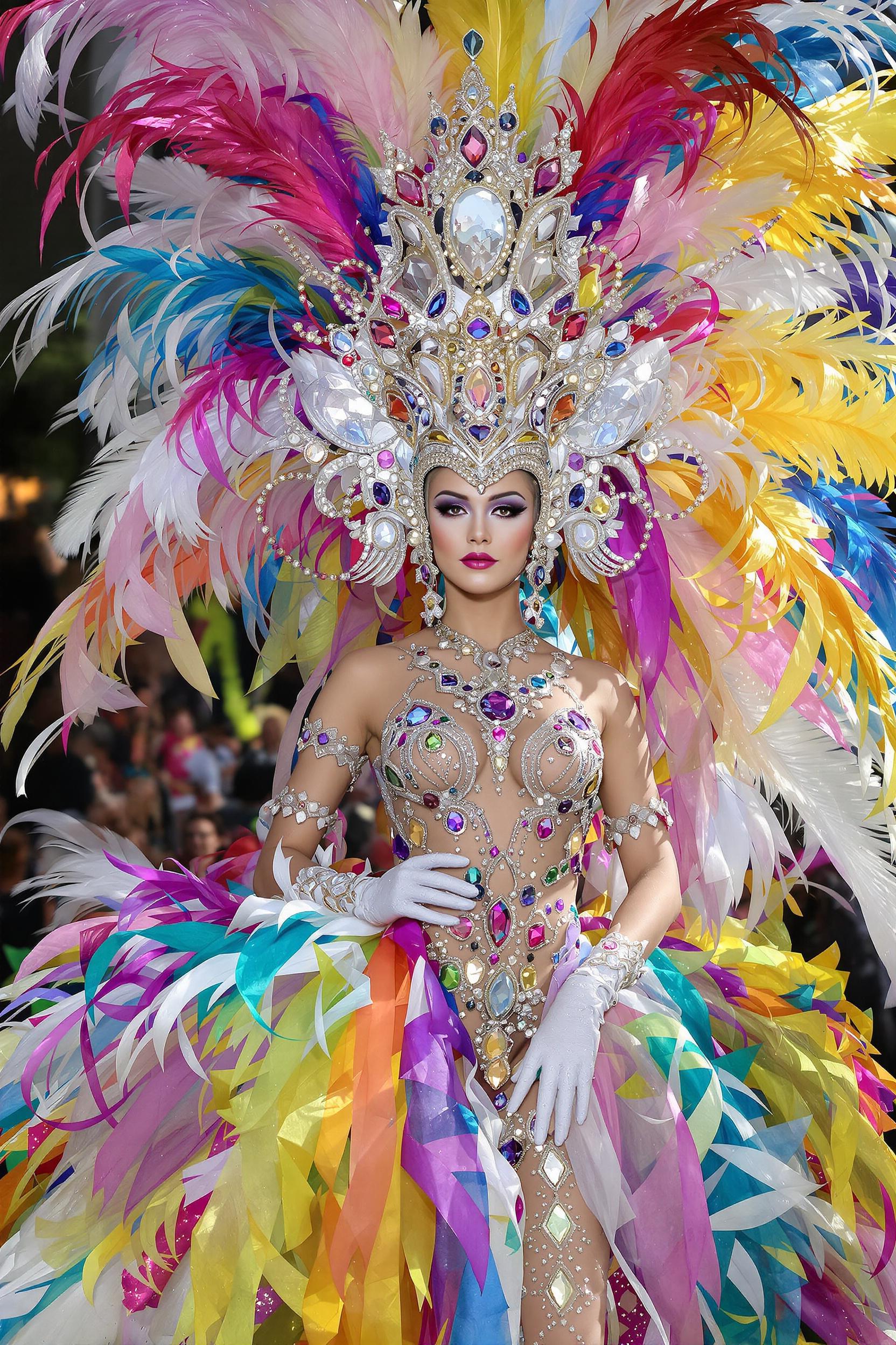 Женщина в сияющем карнавальном костюме: топ из золотых пайеток и камней, пышная юбка из огненно-оранжевых и зеленых перьев, головной убор с длинными перьями, крупные украшения, атласные перчатки, средний план, смотрит в камеру, фон — карнавальные огни Рио.