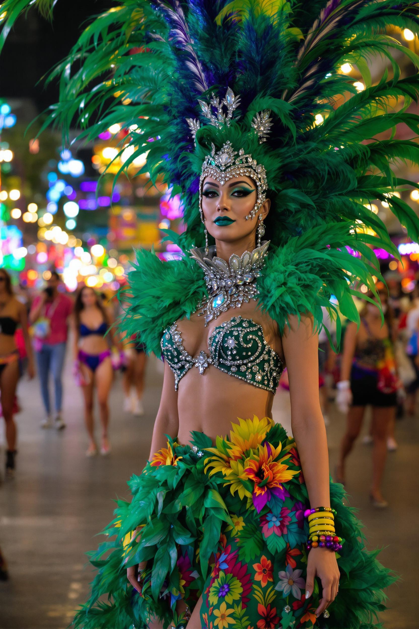 Женщина в уникальном карнавальном костюме: верх из изумрудных перьев, украшенный кристаллами, асимметричная юбка с вышивкой в тропическом стиле, многоцветные браслеты, широкий перьевой воротник, средний план, смотрит в камеру, фон — сияющий парад Рио.