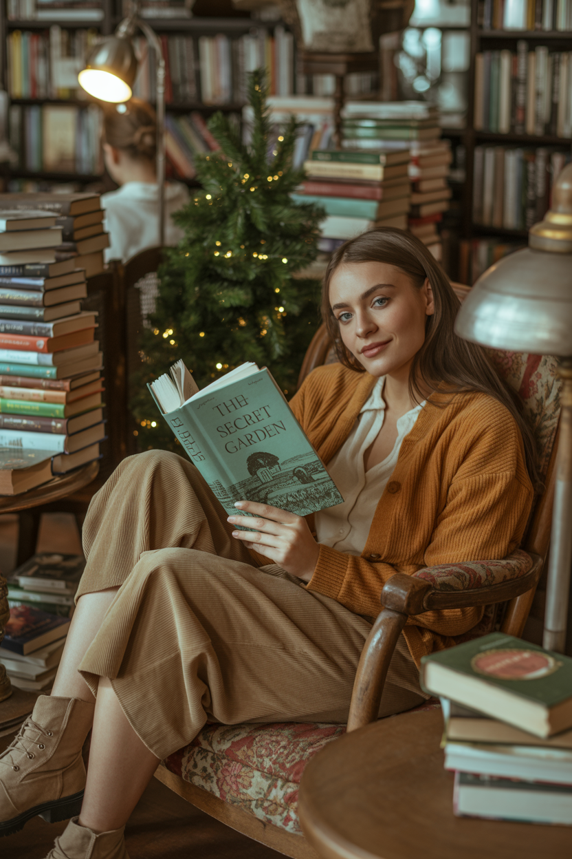 Женщина в уютном книжном магазине рядом с небольшой наряженной ёлкой, одета в тёплый горчичный кардиган поверх молочной блузы, свободные вельветовые брюки, на ногах замшевые ботинки. Она полулежит на мягком кресле, держа на коленях раскрытую книгу, смотрит в камеру, вокруг аромат кофе и книжная атмосфера.