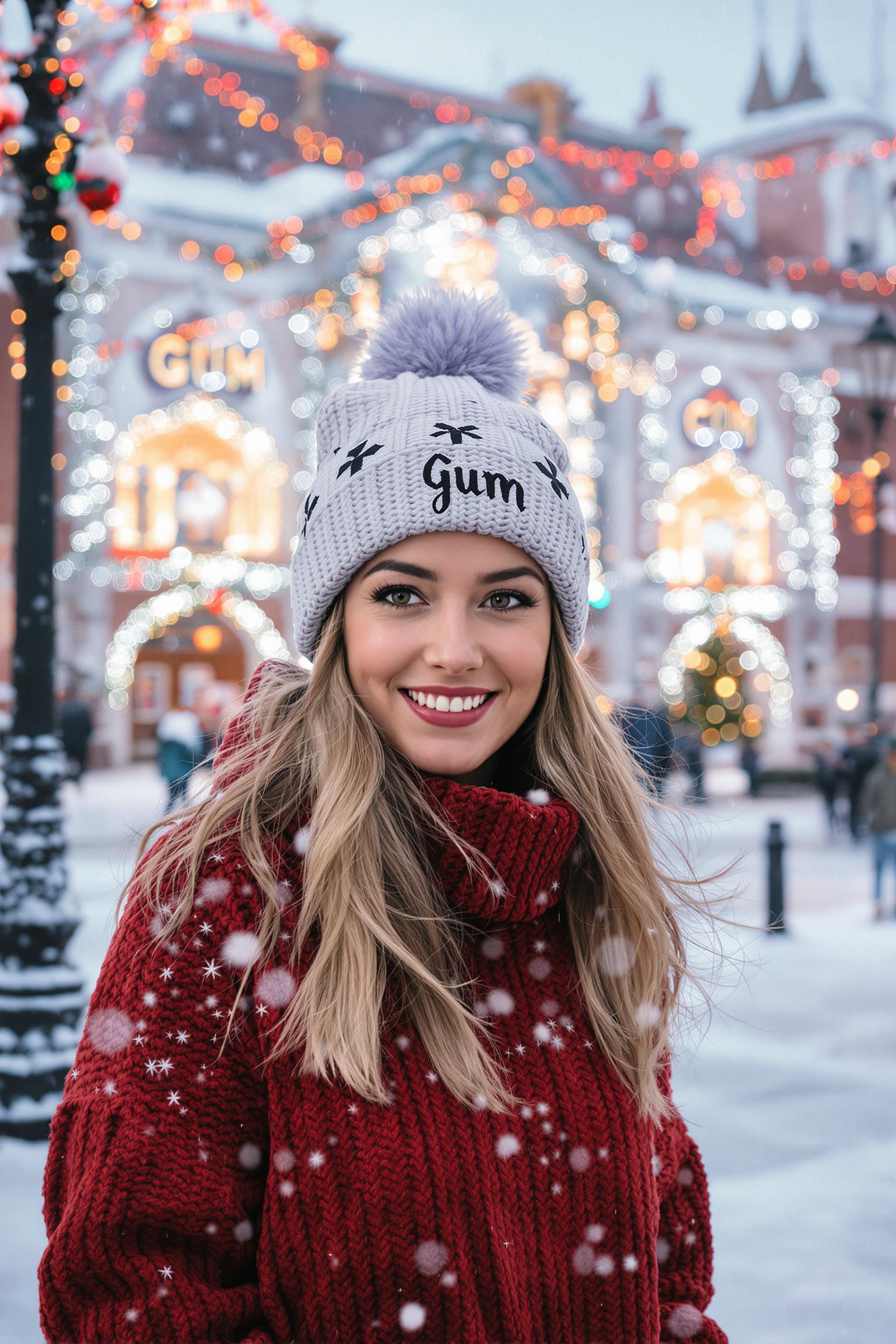 Женщина в уютном вязаном свитере и шапке стоит на фоне заснеженной Красной площади, средний план, смотрит прямо в камеру, позади ярко освещённый ГУМ и праздничные гирлянды, в воздухе лёгкий снег, ощущение зимней сказки.