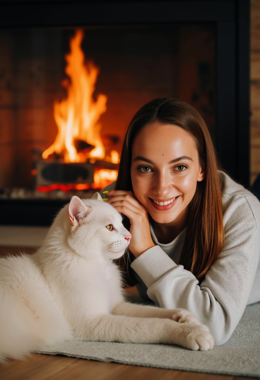 Женщина в уютной кофте лежит на ковре перед камином, рядом с ней пушистый белый кот нежно касается её щёки лапой