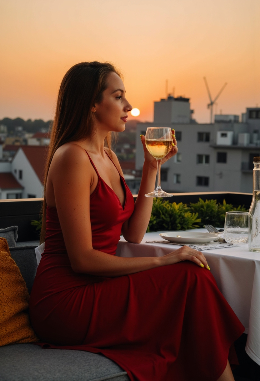Женщина в вечернем платье с бокалом вина сидит на террасе ресторана, за спиной виден закат над городом.