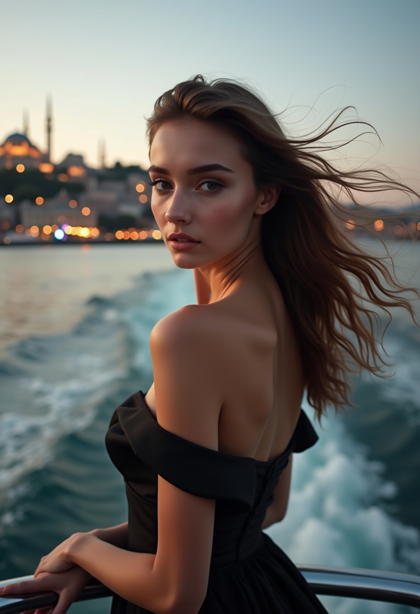 Женщина в вечернем платье с открытыми плечами стоит на палубе кораблика, плывущего по Босфору. Позади — подсвеченные минареты и мост. Она смотрит в объектив, ветер развивает волосы. Крупный план, акцент на контрасте между романтикой и городом.