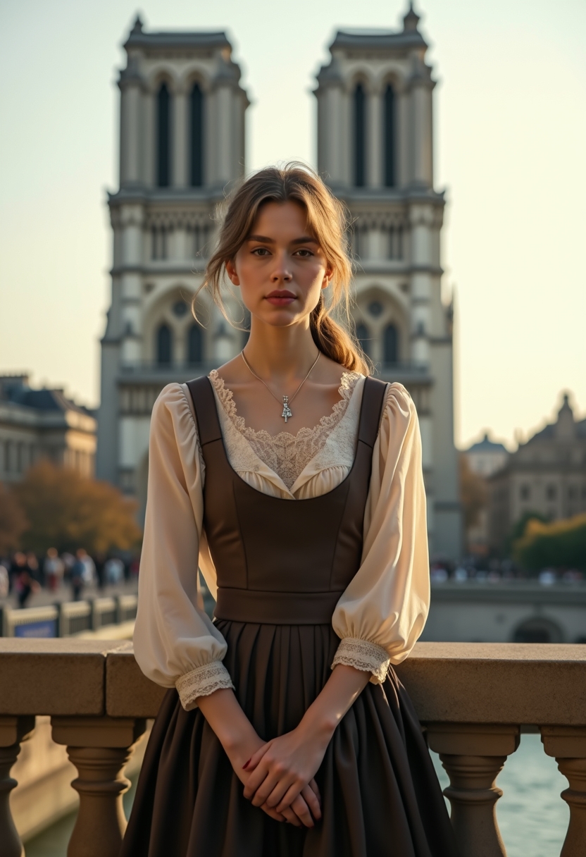 Женщина в винтажном наряде с длинной юбкой и кружевной блузой стоит на балконе с видом на Нотр-Дам. Её руки сложены перед собой, а глаза прикрыты от утреннего солнца. Позади величественные готические башни собора и река Сена. Крупный план, акцент на классической парижской эстетике.