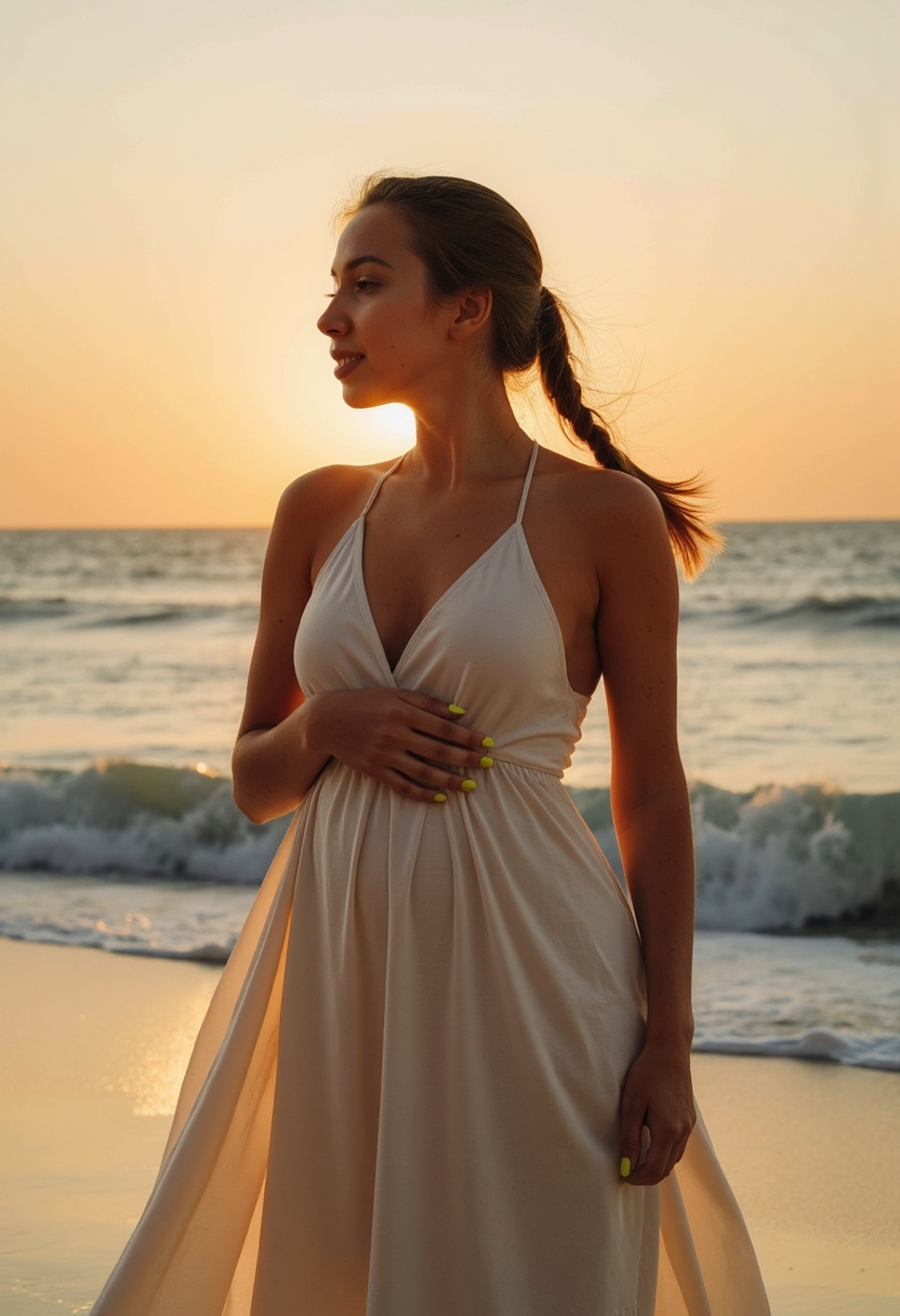 Женщина в воздушном платье стоит на пляже, ветер развевает ткань, руки касаются живота, за спиной закатное море