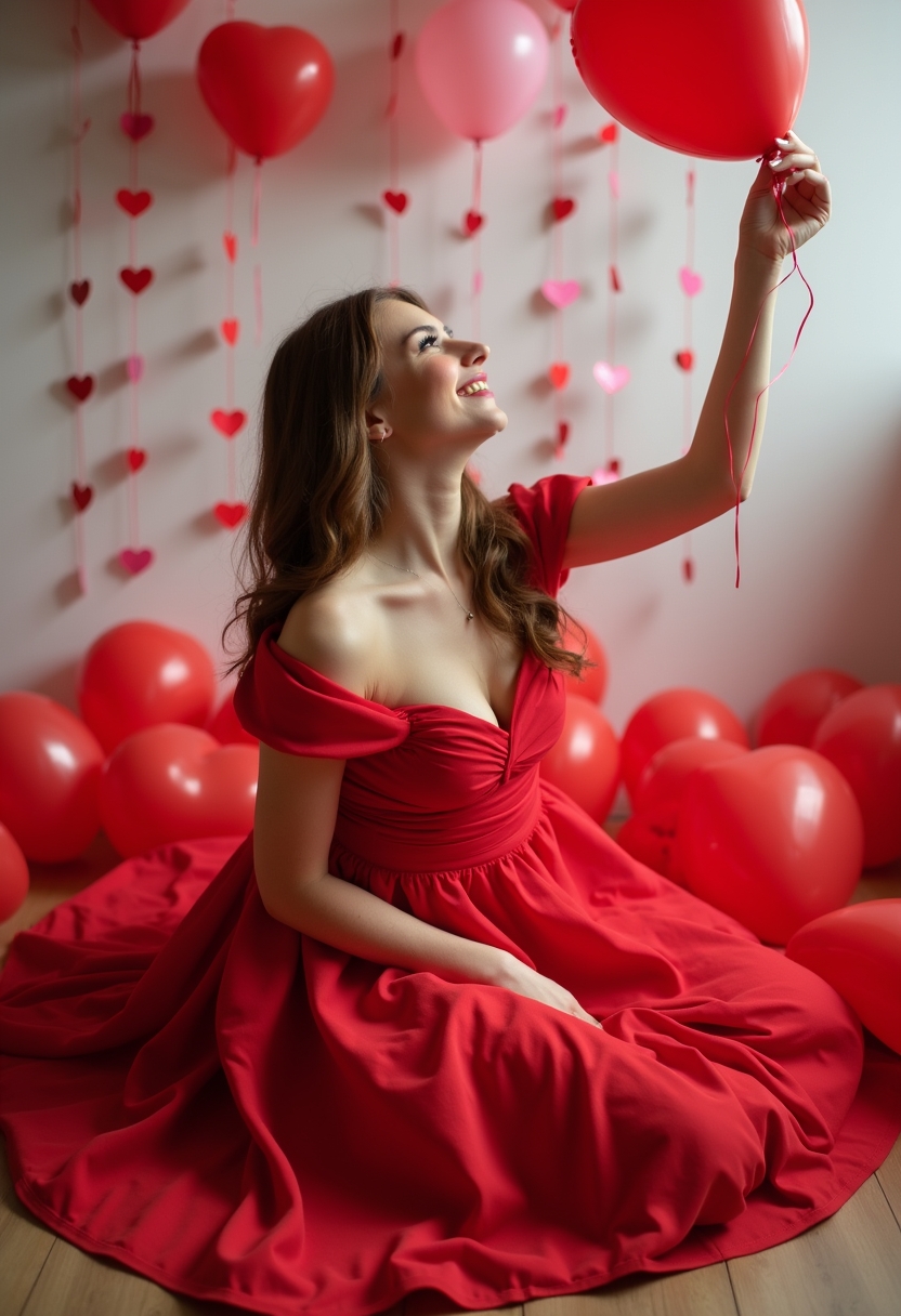 Женщина в ярко-красном платье сидит на полу среди воздушных шаров в форме сердец. Она держит один из шаров и смотрит вверх с мечтательным выражением лица. Позади видны гирлянды. Освещение яркое, акцент на её праздничном настроении.