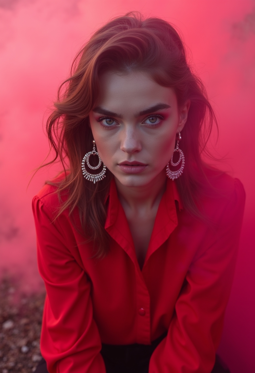Женщина в ярко-красной рубашке и массивных серёжках сидит на фоне ярко-розового дыма. Её лицо крупным планом, взгляд напряжённый. Освещение неоновое, акцент на глубине цвета и плотности дыма.