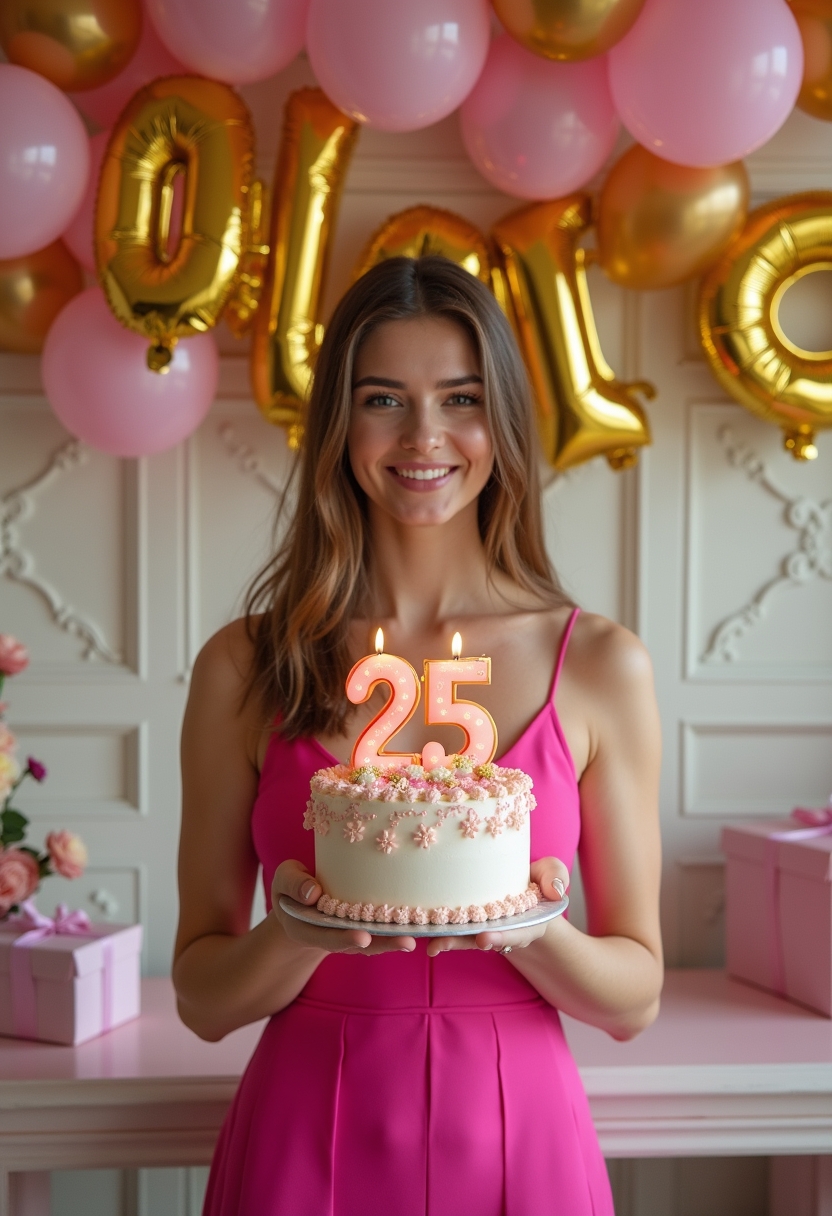 Женщина в ярко-розовом платье с блестками стоит на фоне стены, украшенной золотыми и розовыми шарами. В руках у неё торт с зажжённой свечой в форме цифры 25. Она смотрит прямо в камеру с радостной улыбкой. Позади виден стол с подарками. Освещение яркое, акцент на её праздничном настроении.