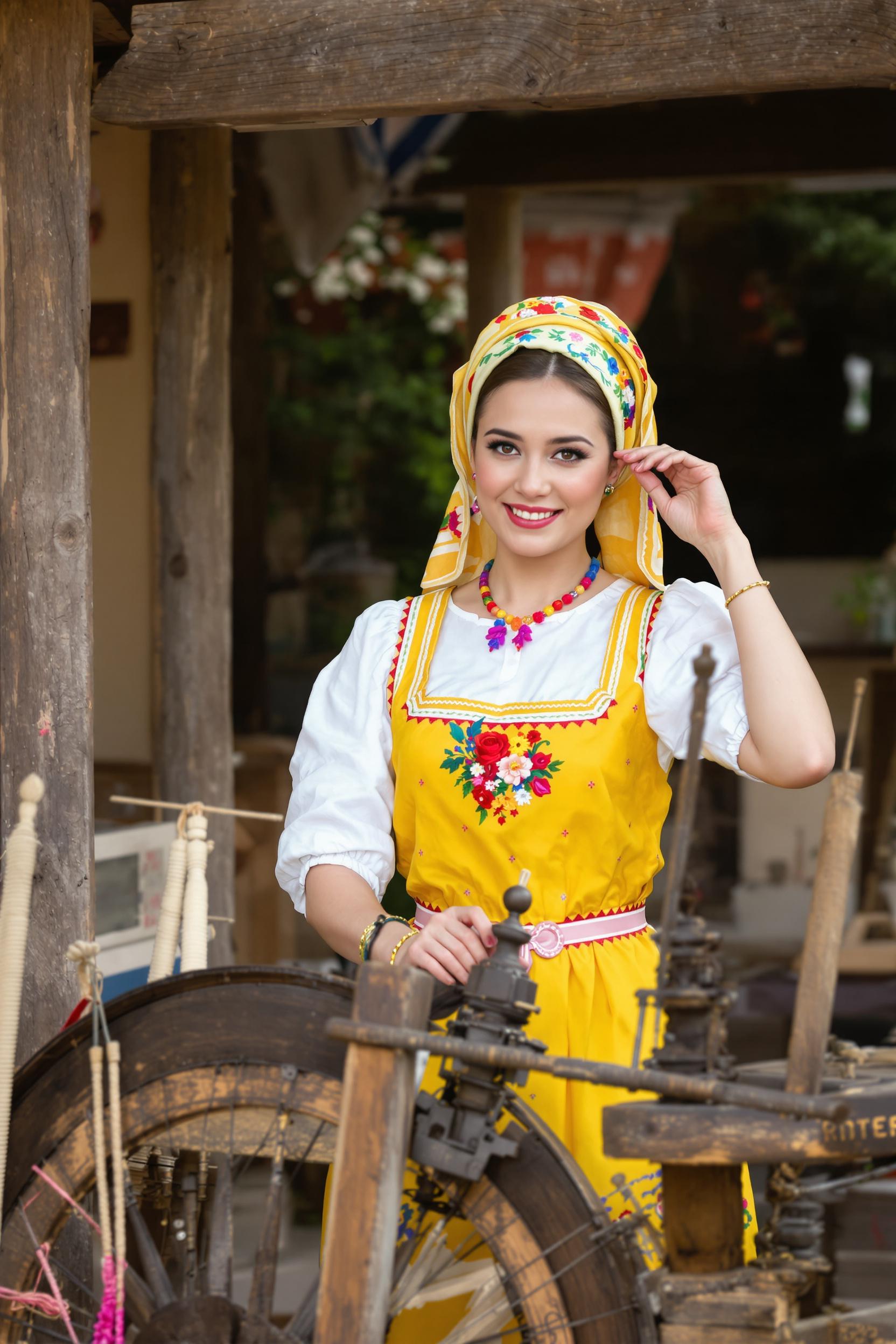 Женщина в ярко-жёлтом сарафане с традиционным орнаментом и белой рубахой стоит у русской прялки, одной рукой держит веретено, а другой поправляет платок на голове. Она внимательно смотрит прямо в камеру, на лице лёгкая улыбка. Средний план, естественный дневной свет.