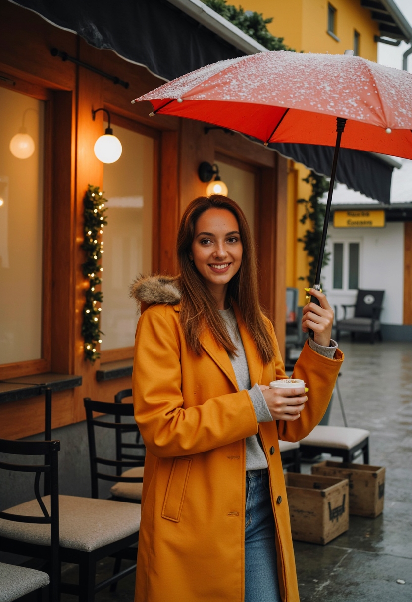Женщина в ярком пальто с зонтом стоит на фоне небольшого уличного кафе с гирляндами, смотрит прямо в камеру, вокруг лёгкий снегопад