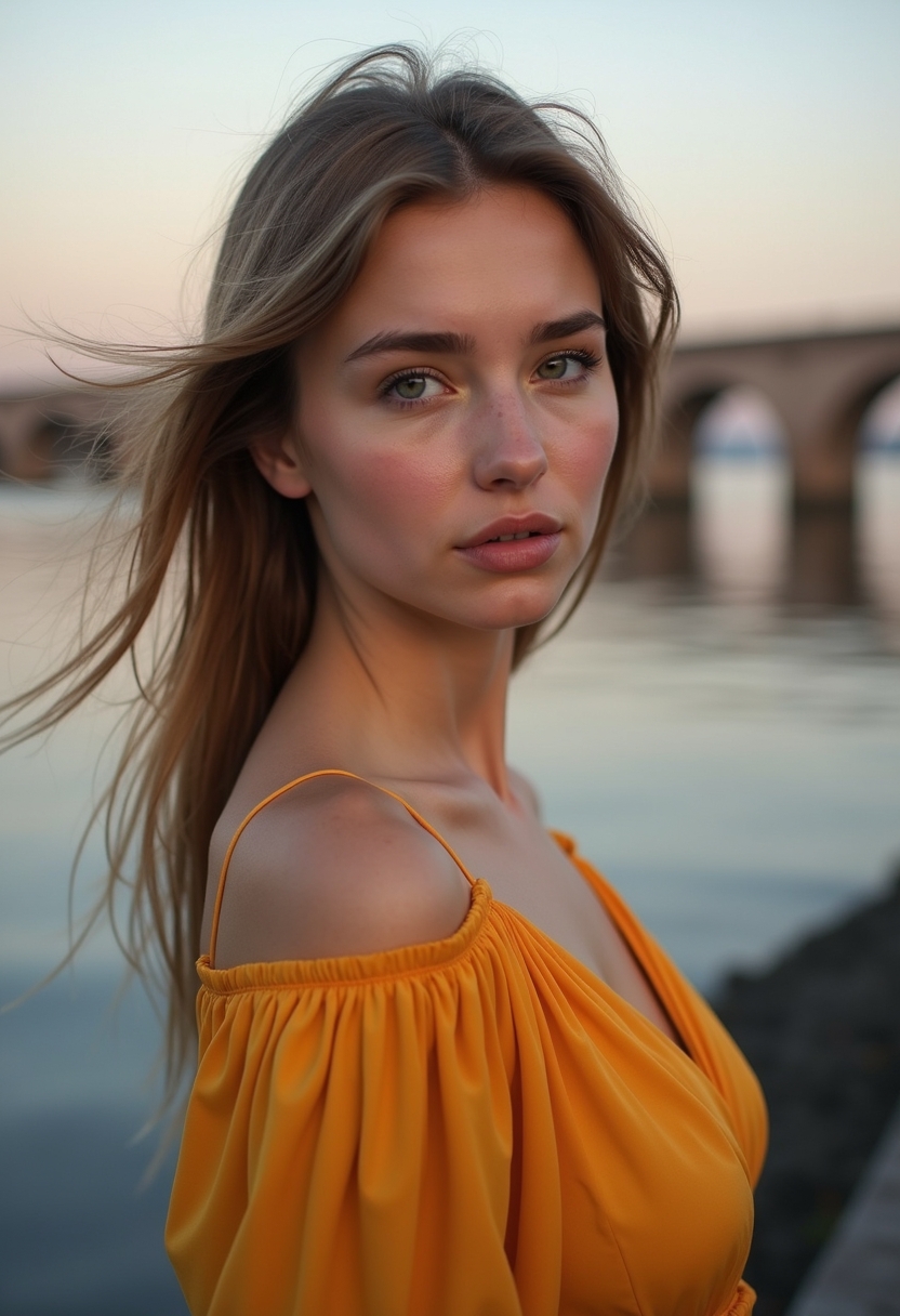 Женщина в ярком платье, стоящая на фоне разводных мостов Санкт-Петербурга, смотрит в камеру. Ее лицо крупным планом, с мягким освещением, подчеркивающим черты. На заднем плане видны романтичные очертания мостов, идущих через реку, в легком сумеречном свете. Ветер слегка поднимает подол платья, создавая ощущение динамики. Тонкая линия горизонта разделяет небо и воду, придавая фотографии глубину.