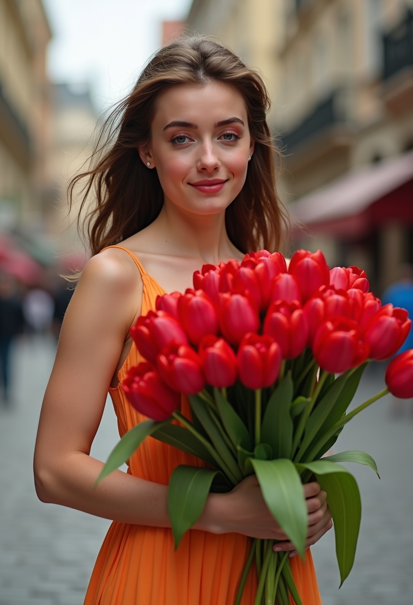 Женщина в ярком сарафане держит в руках массивный букет красных тюльпанов, её пальцы мягко касаются лепестков. Она слегка склонила голову, закрыв глаза, будто наслаждается ароматом цветов. Позади размытые очертания городской улицы с элегантными фасадами. Крупный план, подчёркивающий контраст между урбанистическим фоном и природной красотой цветов.