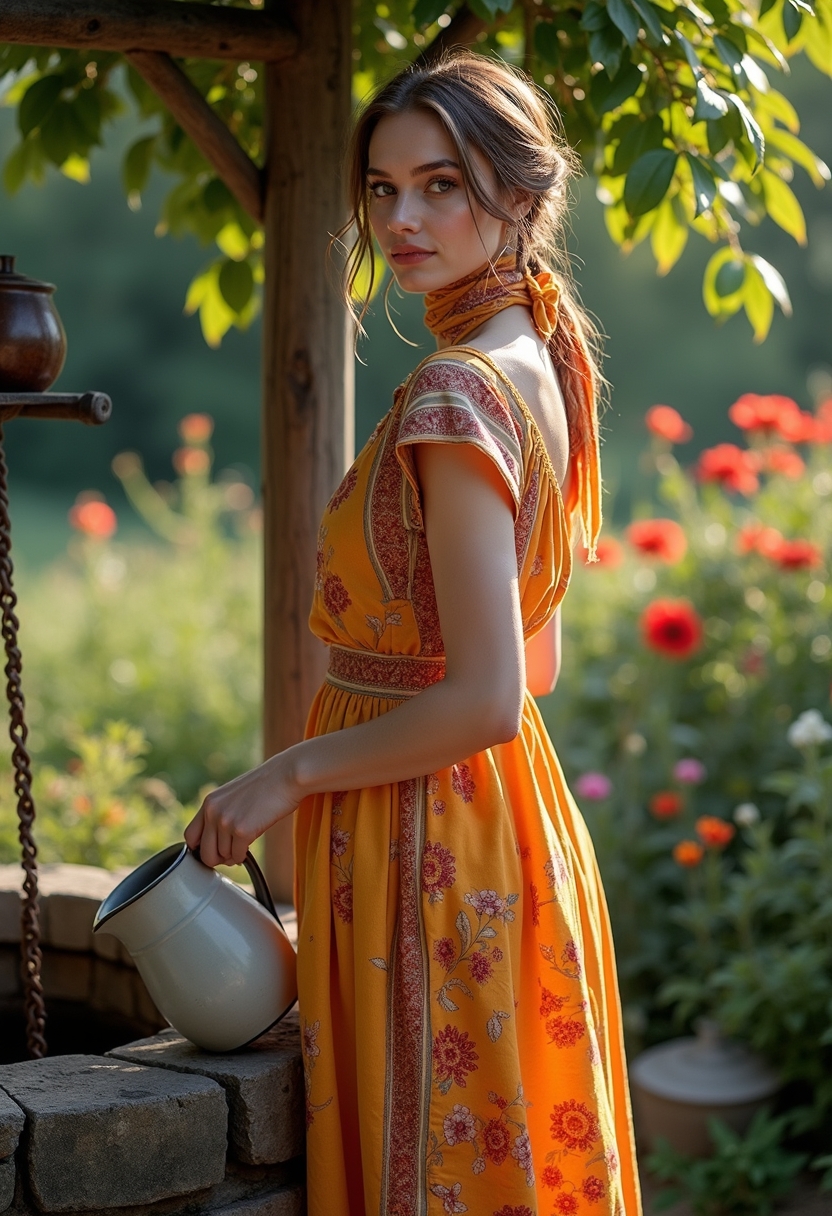 Женщина в ярком сарафане с узорами и платке стоит у старого колодца. Она держит кувшин и смотрит через плечо в камеру. Позади виден большой огород с цветущими растениями. Освещение естественное, акцент на её традиционном образе.
