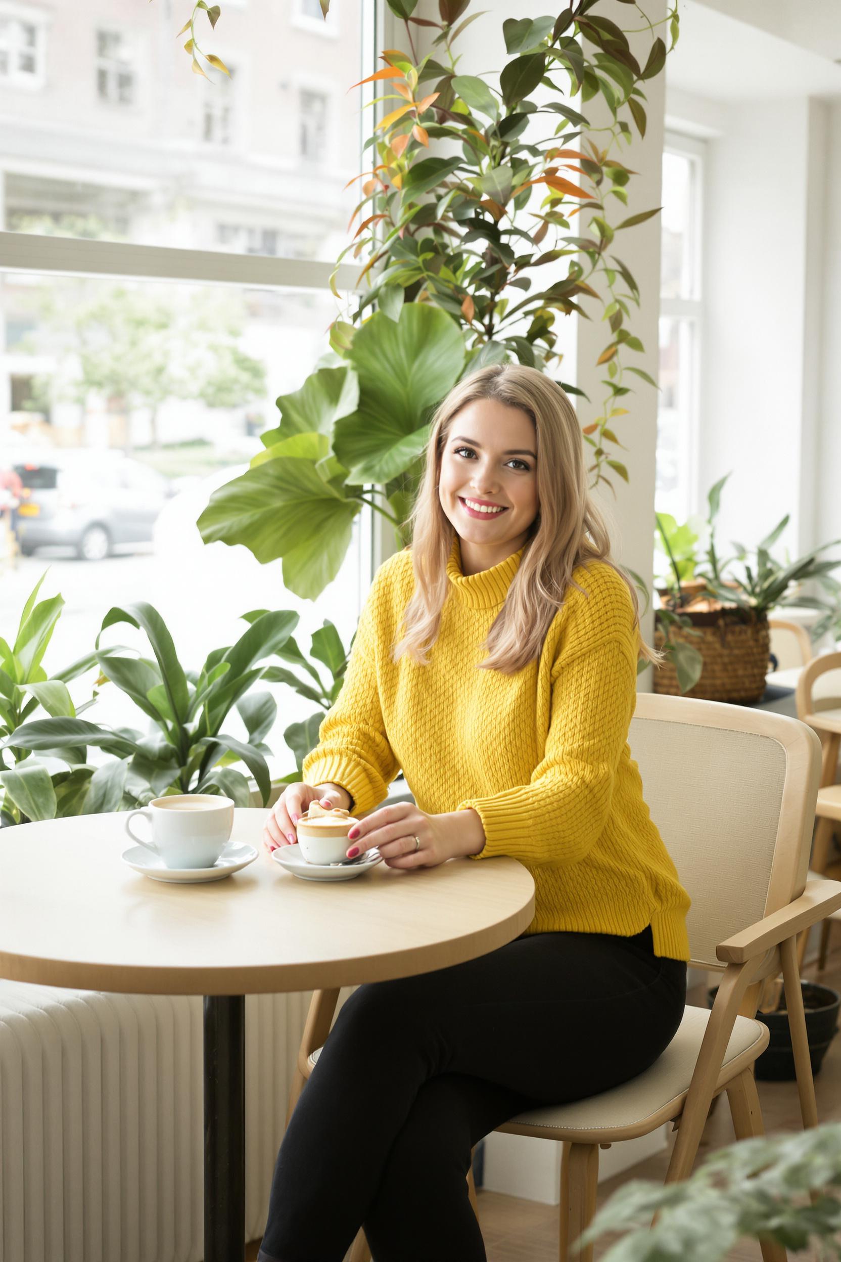 Фото женщины в жёлтом свитере в скандинавской кофейне