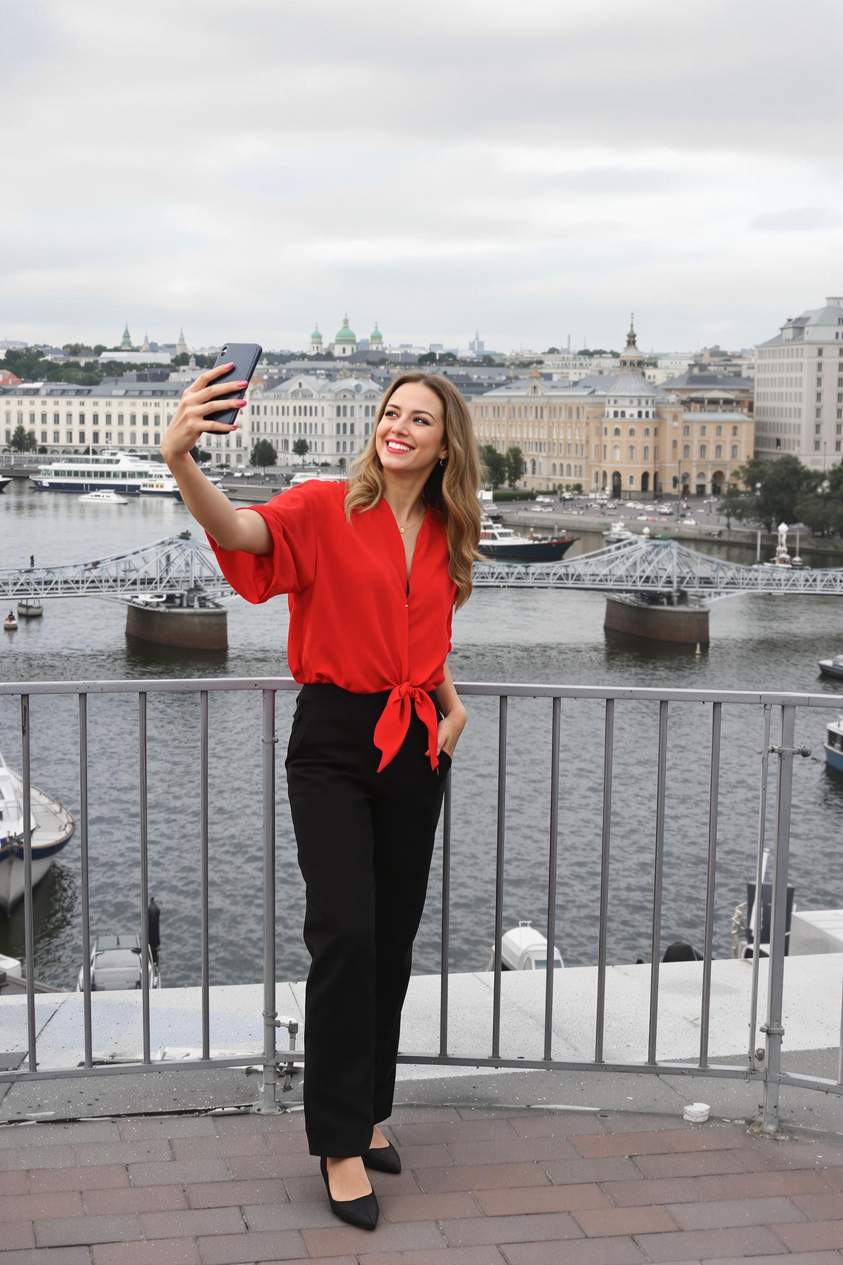 Женщина в яркой блузе и тёмных брюках стоит на крыше дома в Петербурге, делает фото на смартфон на фоне разводных мостов. Она улыбается, слегка наклонив голову, в глазах радость. Крупный план.