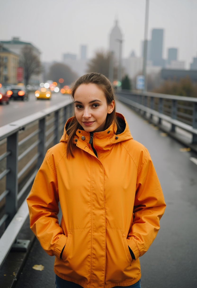 Женщина в яркой куртке стоит на мосту, под которым виден городской трафик, смотрит прямо в камеру