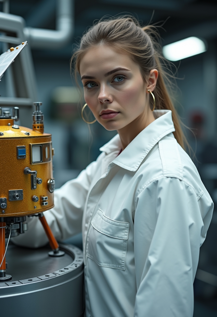 Женщина в защитном комбинезоне стоит рядом с моделью спутника, её лицо в фокусе, волосы убраны, выражение — рабочее. Позади инженерная среда и элементы модулей. Крупный план, акцент на научном подходе.
