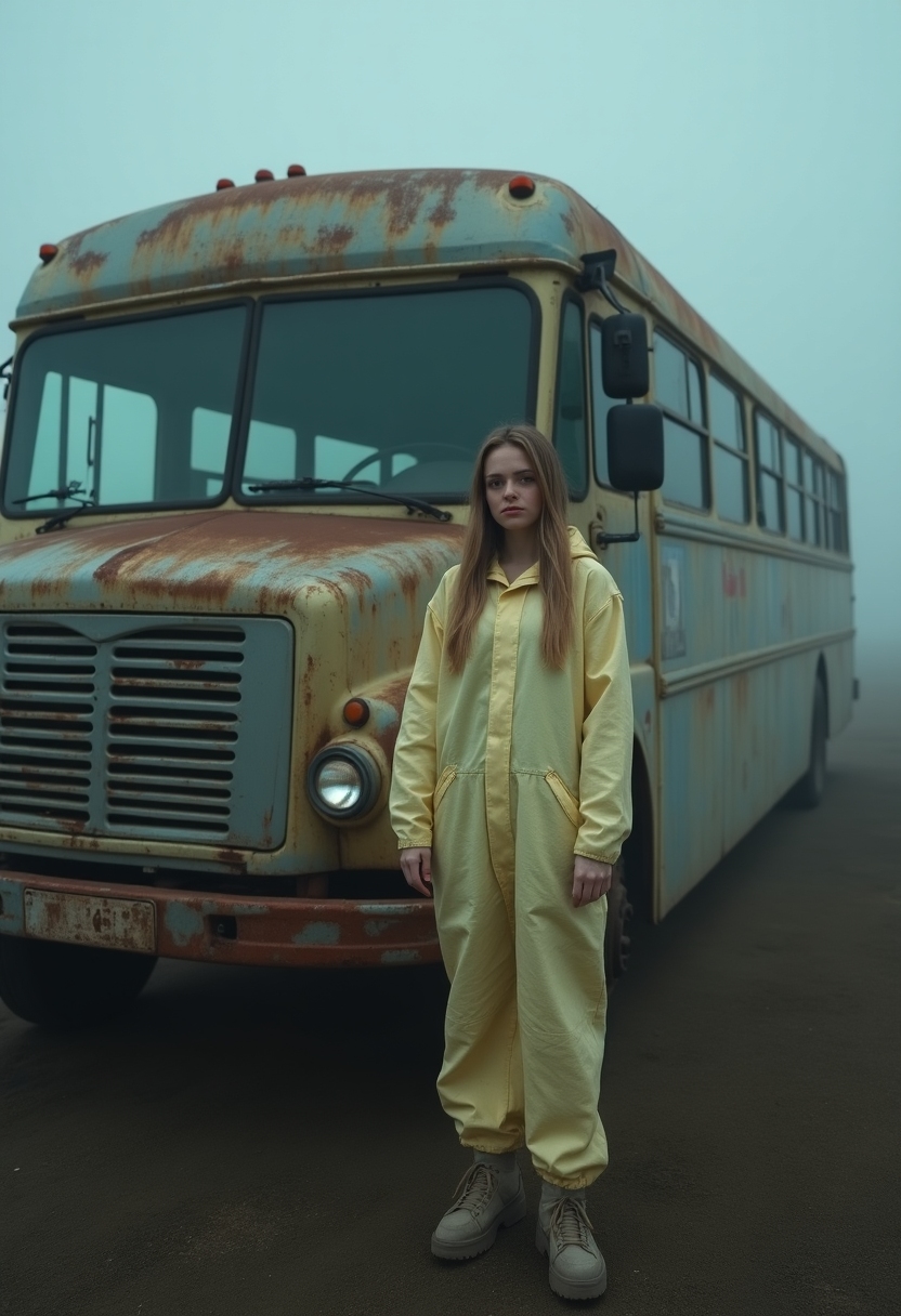 Женщина в защитном костюме стоит рядом с ржавым автобусом, окружённым туманом, смотрит прямо в камеру