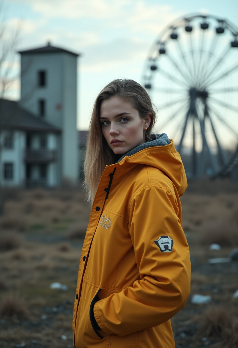 Женщина в защитном костюме стоит среди разрушенных зданий Припяти, смотрит прямо в камеру, за спиной колесо обозрения