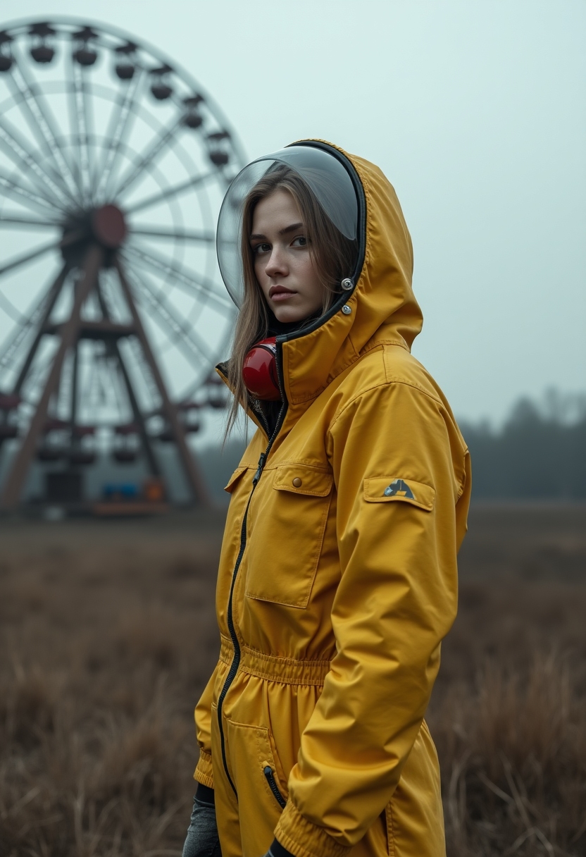 Женщина в защитном костюме стоит среди разрушенных зданий Припяти, за спиной старое колесо обозрения