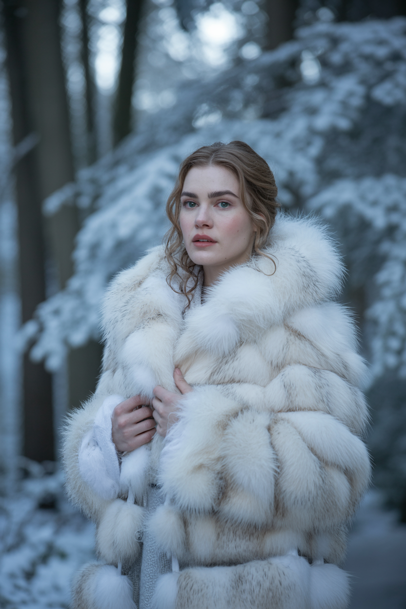 Женщина в заснеженном лесу в роскошной белой шубе с объемным капюшоном из длинного меха. Стоит в среднем плане, смотрит прямо в камеру, легкий естественный макияж, волосы распущены мягкими волнами. Атмосфера ретро-журнала, акцент на контрасте пушистого меха и зимнего пейзажа.