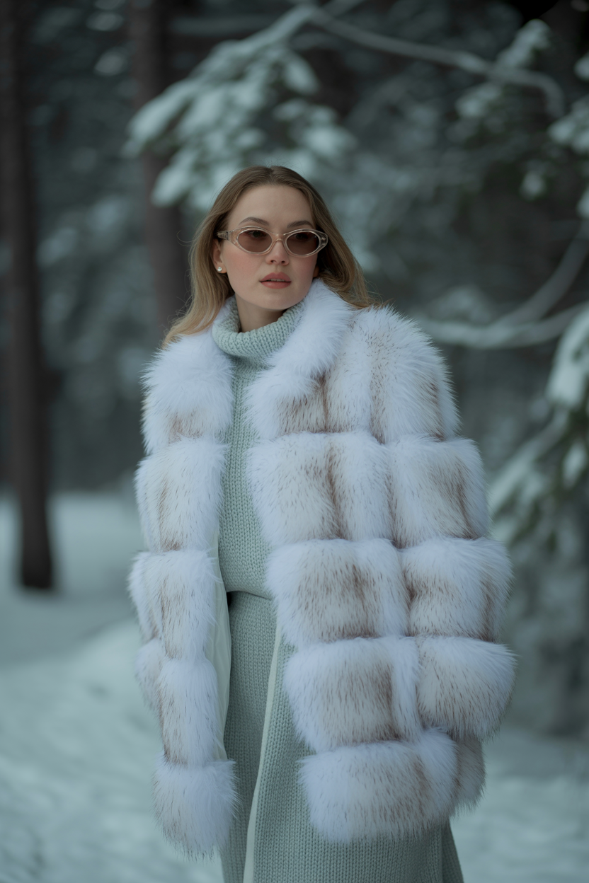 Женщина в заснеженном лесу в роскошной белой шубе средней длины, под ней светло-серое трикотажное платье с высокой горловиной. Стоит в среднем плане, смотрит прямо в камеру, на лице естественный макияж, волосы распущены, атмосферу дополняют ретро солнечные очки и теплые сапоги.