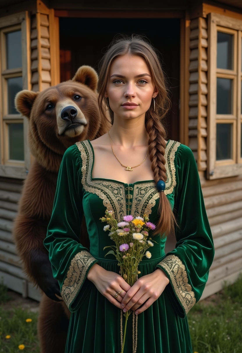 Женщина в зелёном бархатном сарафане с длинными рукавами, украшенными золотым орнаментом, стоит бок о бок с медведем. Её лицо освещает тёплый свет, а в руках она держит небольшой пучок полевых цветов. Позади деревянная изба с резными наличниками, создавая традиционный русский колорит.