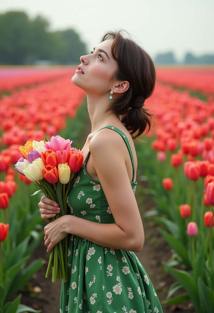 Женщина в зелёном платье с цветочным узором позирует в поле с тюльпанами. Она держит букет разноцветных цветов, а её взгляд направлен вверх. Позади видны бескрайние цветущие поля. Освещение естественное, акцент на её ярком образе и природе.