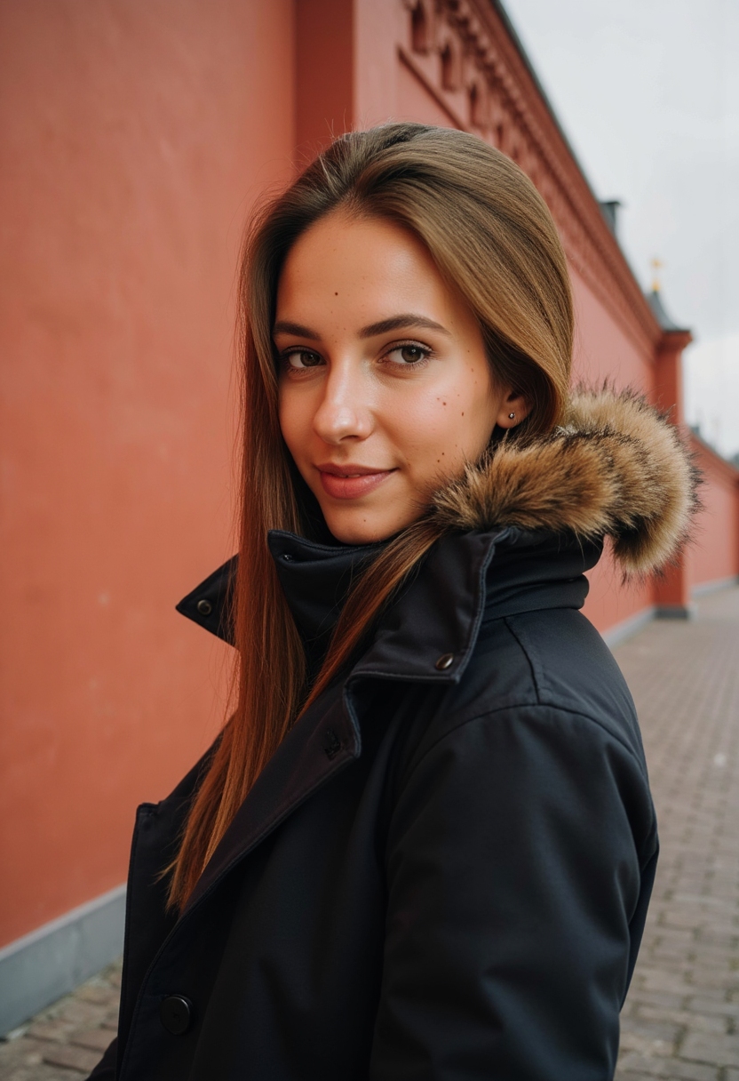 Женщина в зимнем костюме с меховым капюшоном стоит на фоне красной кирпичной стены Кремля, смотрит прямо в камеру
