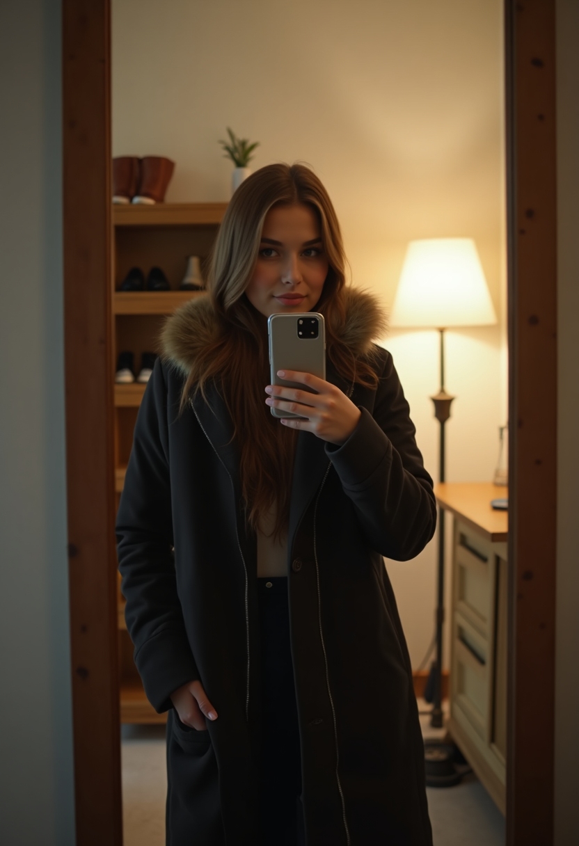 Женщина в зимнем пальто делает селфи в зеркале прихожей, за ней полка с обувью и мягкий свет настольной лампы