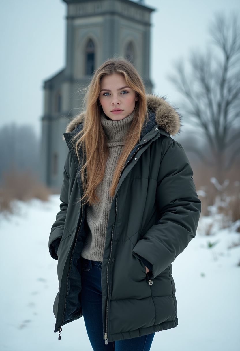 Женщина в зимнем пальто стоит в снегу на фоне разрушенной башни, смотрит в камеру с серьёзным выражением лица