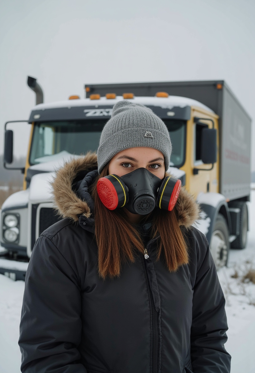 Женщина в зимней одежде и респираторе стоит у разрушенного грузовика, окутанного густым туманом, смотрит в камеру