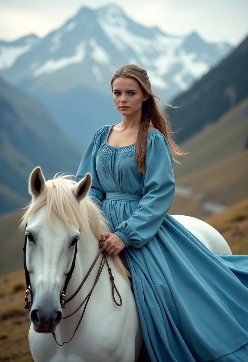 Женщина верхом на белом коне, её длинное голубое платье свободно спадает вниз, руки легко держат поводья. Позади извилистая горная тропа, ведущая к заснеженным вершинам. Её волосы слегка развеваются ветром. Крупный план, создающий ощущение романтики и приключения.