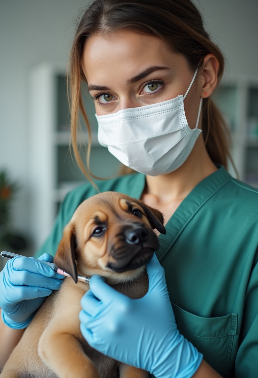 Женщина-ветеринар в маске и перчатках делает укол щенку на руках у владельца. Её взгляд сосредоточен и внимателен, позади — чистый и современный кабинет. Крупный план, атмосфера ответственности и заботы.