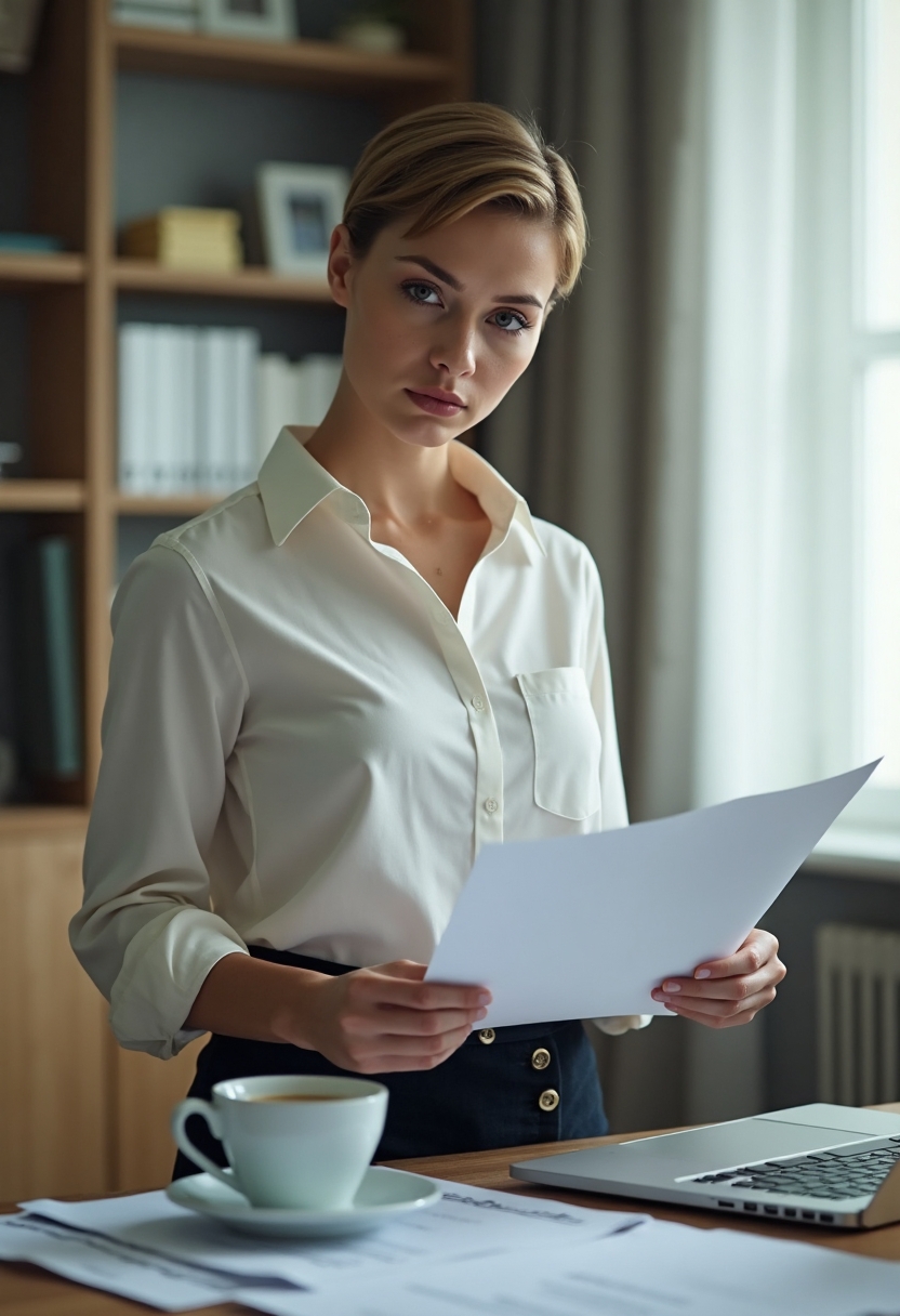 Женщина-юрист с короткой стрижкой и в строгой юбке листает бумаги, стоя у рабочего стола с ноутбуком и чашкой кофе. Она смотрит в камеру сосредоточенно. Крупный план, атмосфера серьёзности.