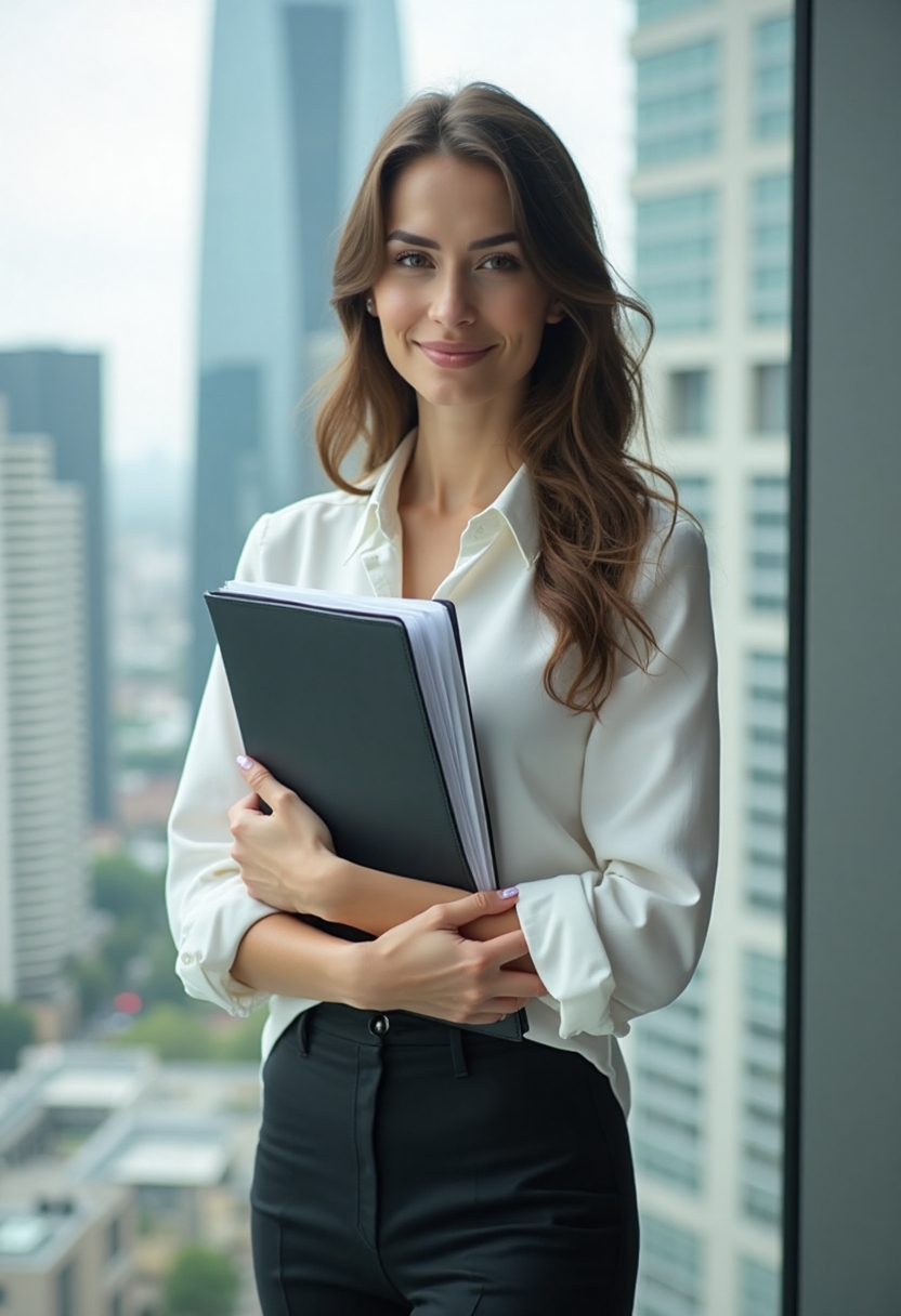 Женщина-юрист в белой блузе и тёмных брюках стоит у большого окна, на фоне — городские высотки. Она держит в руках папку с документами и смотрит в камеру с уверенной улыбкой. Крупный план, стиль деловой городской жизни.