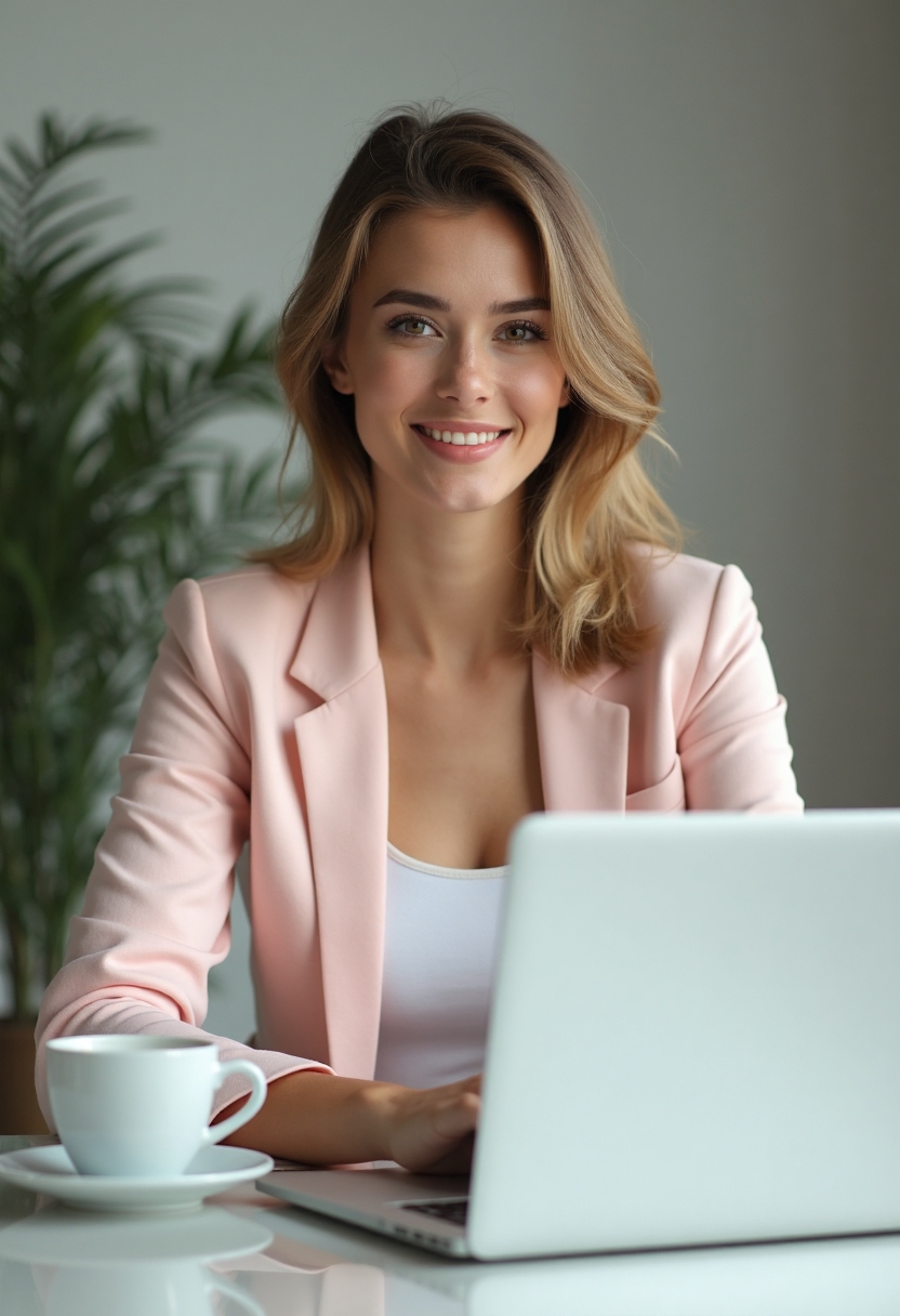 Женщина-юрист в пастельном костюме и белой майке сидит за столом с ноутбуком и чашкой кофе, слегка приподняв голову и улыбаясь в камеру. На фоне — минималистичный офис и живое растение. Крупный план.