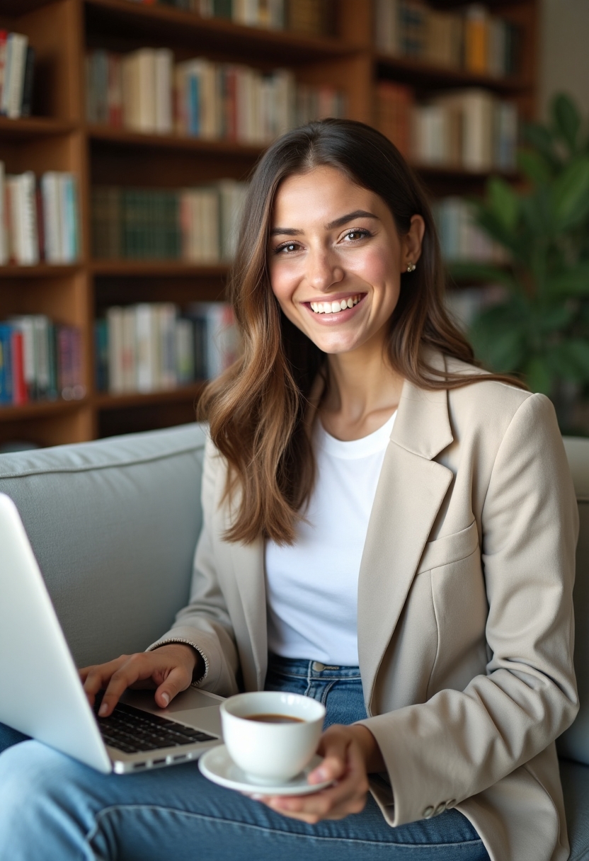 Женщина-юрист в повседневной светлой одежде сидит на мягком диване с ноутбуком на коленях и чашкой чая, улыбаясь прямо в объектив. Позади полка с книгами и светлый уютный интерьер. Крупный план.
