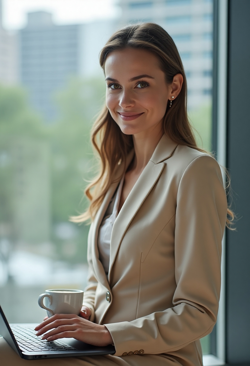 Женщина-юрист в стильном бежевом костюме сидит на краю стола с чашкой кофе, в одной руке держит открытый ноутбук, улыбаясь в камеру. Позади современный офис с панорамными окнами. Крупный план, атмосфера успеха и легкости.