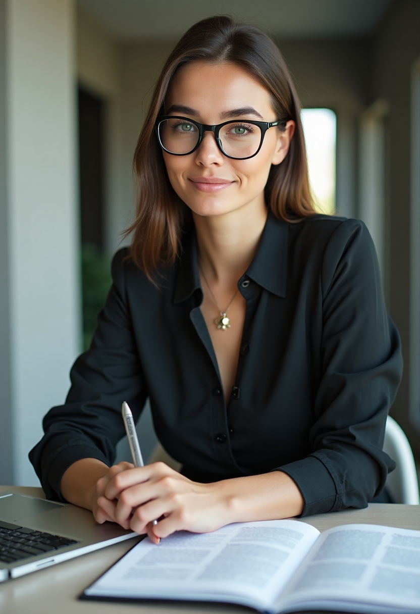 Женщина-юрист в строгой блузе и очках листает кодекс, сидя за столом с открытым ноутбуком и заметками. Она смотрит в камеру, фон — современный офис. Крупный план, профессиональный образ.