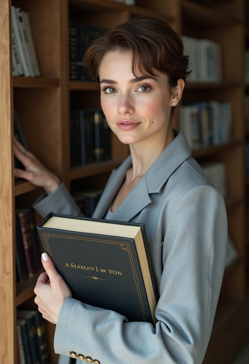 Примерить образ на себеЖенщина-юрист в светло-сером жакете с короткой стрижкой держит в руках толстый юридический справочник, стоя у книжного шкафа. Она смотрит в камеру, легко опираясь на полку. Крупный план, современный стиль.