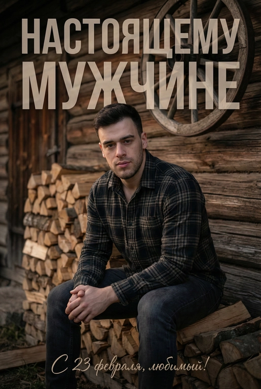 ИИ создаст реалистичную открытку ко Дню защитника Отечества в рустикальном стиле. На фото — портрет мужчины на фоне деревянного дома и дров, с тёплой атмосферой деревни. Введите, кому предназначена открытка — подпись отобразится на картинке.