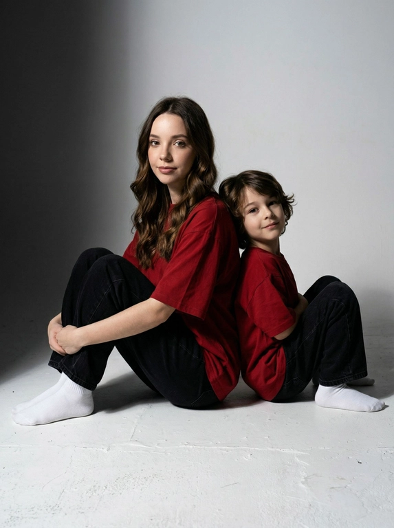 Нейросеть сделает парный портрет «спина к спине»: женщина и ребенок сидят на полу с согнутыми коленями, опираются друг на друга и смотрят в кадр с мягкими улыбками. Одинаковый образ в красных оверсайз футболках. Загрузите 1–2 фото людей для сходства.