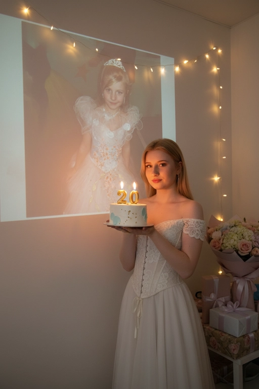ИИ сделает стильное фото на день рождения: вы держите торт, а на стене проецируется ваше детское фото. Совмещаются настоящее и прошлое, создавая тёплую ностальгическую атмосферу. Для результата опишите детали: декор, стиль одежды, свечи, элементы праздника.