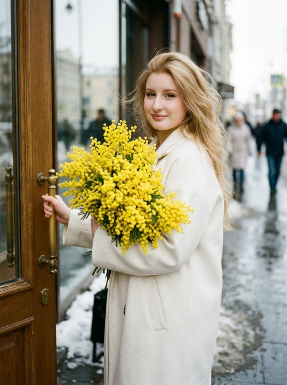 ИИ сгенерирует фотореалистичный портрет: женщина в светлом пальто держит большой букет жёлтой мимозы у входа в городское кафе с деревянной дверью и стеклом. Весенняя атмосфера, натуральные цвета, мягкий свет. Необходимо загрузить своё фото для генерации результата.