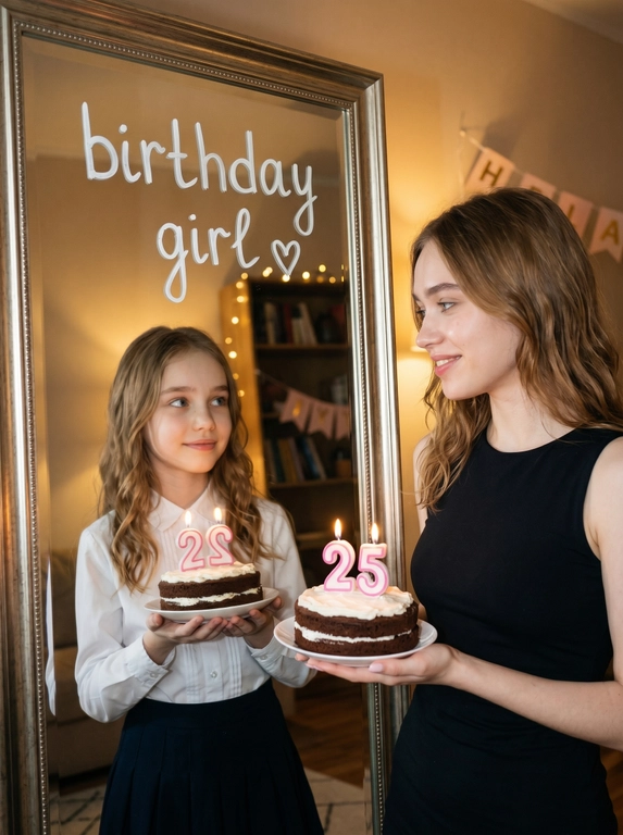 ИИ соберёт фотореалистичное фото: вы стоите у зеркала с тортом, а в отражении — вы же в детстве, с теми же свечами-цифрами. Тёплый домашний свет, лёгкий винтаж и трогательный взгляд сквозь годы. Заполните надпись на зеркале и цифру на торте.