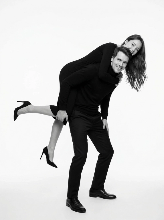 Загрузите фото — получите ч/б студийный кадр: пара в движении, игриво и стильно