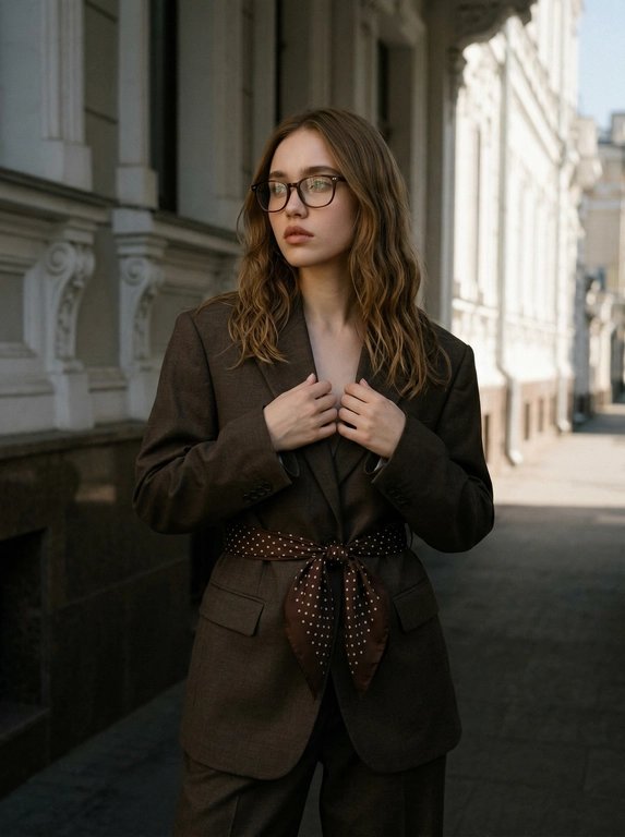 Нейросеть сделает городской портрет в деловом стиле: тёмный оверсайз-костюм, шёлковый платок вместо ремня и очки. Вы поправляете пиджак и смотрите в сторону. Кадр чуть затемнённый, с ощущением движения и плёночным настроением. Нужно загрузить одно фото.