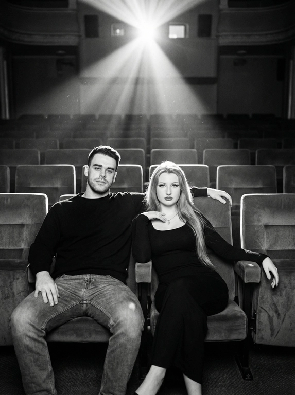 Создайте стильный чёрно-белый портрет вдвоём в пустом кинозале с атмосферой кино.
