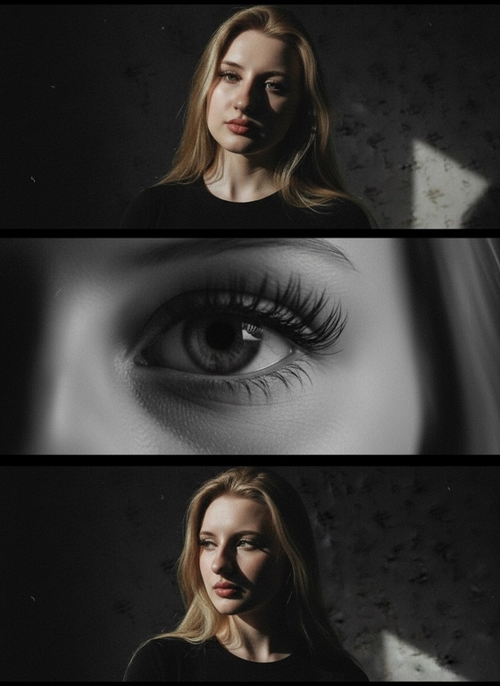 Драматичный коллаж из трёх кадров на основе вашего фото: выразительный портрет с тайнственным светом, суперчёткий крупный план глаза и уверенный взгляд в профиль. Стиль raw, винтажная плёночная зернистость, драматичные тени.